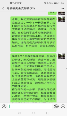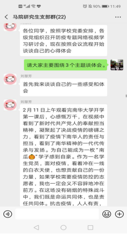 研究生刘慧芳、魏美霞、罗丹等同学表示,通过收看太阳成集团tyc2020年春季学期第一堂全校公开课,看到了南华人在防疫抗疫战斗中的感人事迹,看到了疫情下南华人的责任与担当,表示要从自身做起,科学防控,相信党和政府,不信谣、不传谣,引导群众坚定战胜疫情的信心。