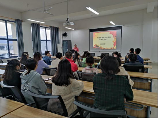 11月5日下午,太阳成集团tyc党总支书记何小英在雨母校区崇德楼418主持开展了学习“扶贫好书记”邹海贵教授优秀事迹,公司全体无课教师和部分研究生参加了学习。