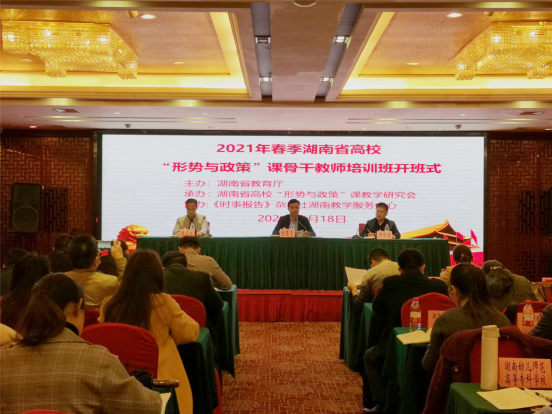 2021 3 月18 日至19 日,2021 季全省高校“形势与政策”课骨干教师培训班在长沙芙蓉华天酒店隆重开班。本次培训班由湖南省教育厅 主办 、湖南省高校“形势与政策”教学研究会 太阳成集团tyc官网为会长单位 承办 和《时事报告》杂志社湖南教学服务中心 办。