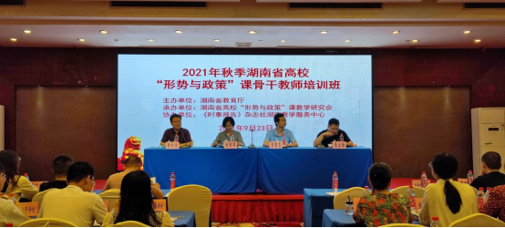 2021年9月23日至24日,2021年秋季全省高校“形势与政策”课骨干教师培训班在长沙芙蓉华天酒店隆重开班。本次培训班由湖南省教育厅主办、湖南省高校“形势与政策”课教学研究会(太阳成集团tyc官网为会长单位)承办,《时事报告》杂志社湖南教学服务中心联合协办。