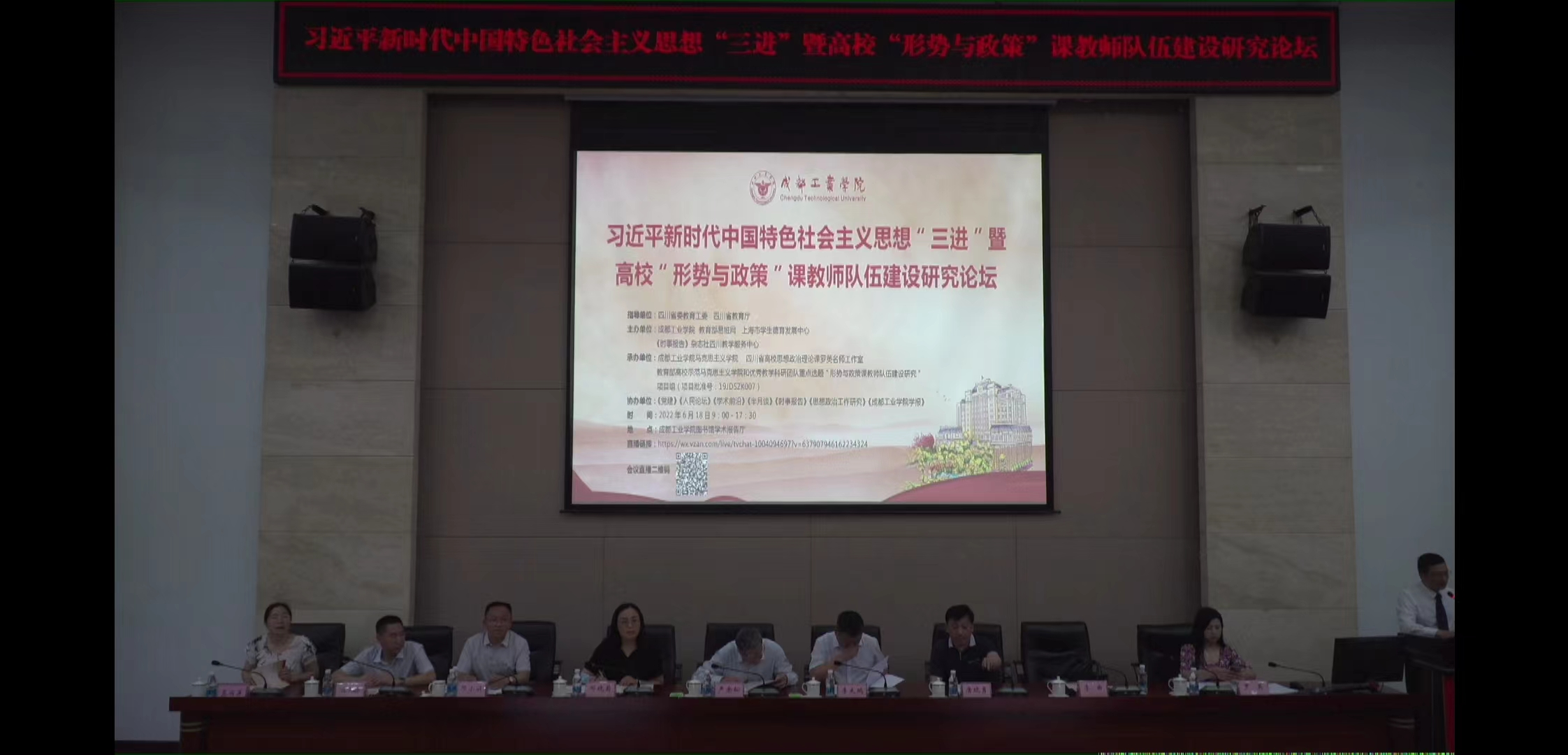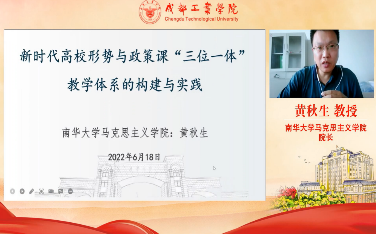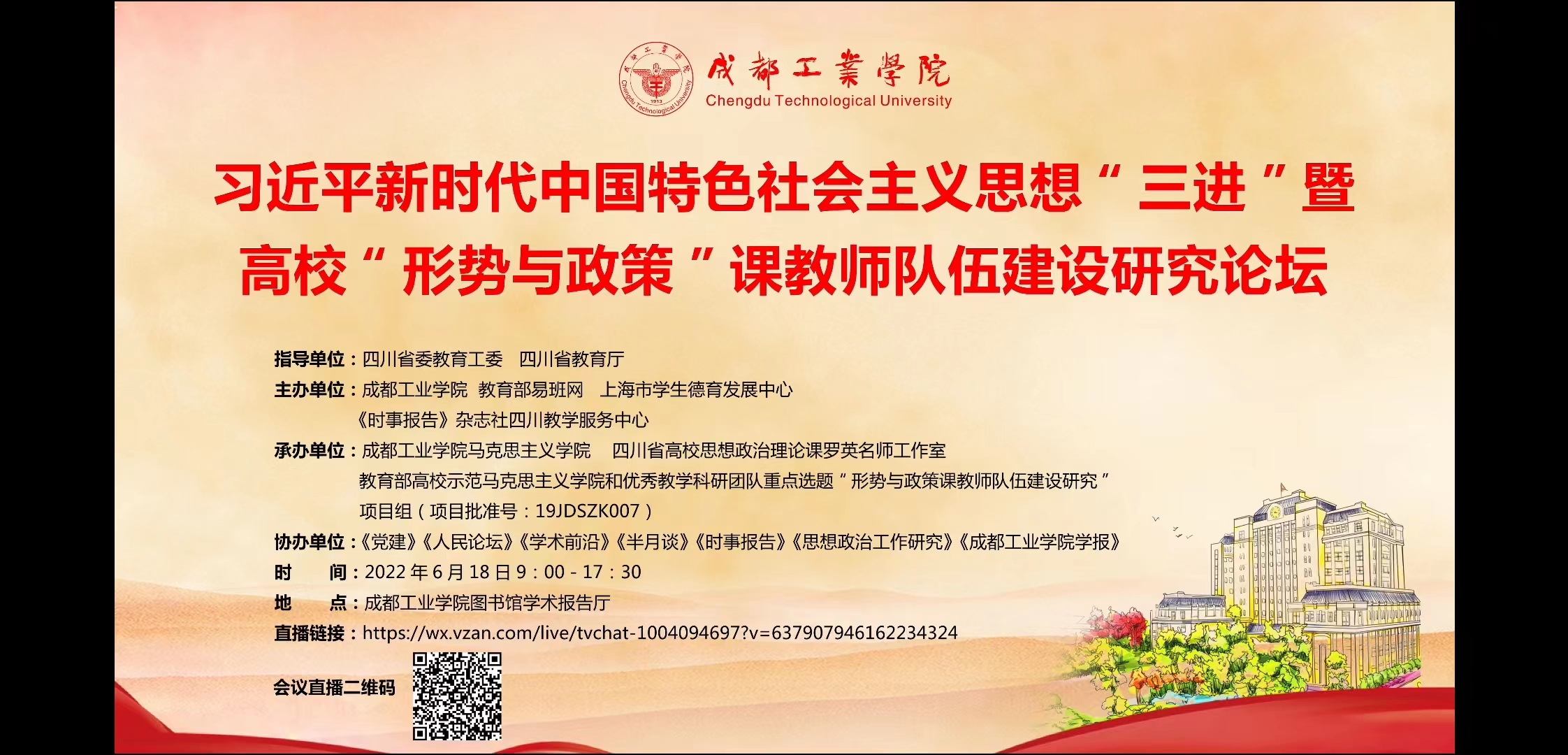 618日,由成都工业公司教育部易班网、上海市员工德育发展中心、中宣部《时事报告》杂志社主办,成都工业公司太阳成集团tyc、四川省高校思想政治理论课罗英名师工作室、教育部高校示范太阳成集团tyc和优秀教学科研团队重点选题“‘形势与政策’课教师队伍建设研究”项目组(项目批准号:19JDSZK007)承办的习近平新时代中国特色社会主义思想“三进”暨高校“形势与政策”课教师队伍建设研究论坛成都工业公司图书馆学术报告厅举行,会议采取线上线下相结合的形式进行,公司经理黄秋生教授受邀参加本次论坛并作主题发言。