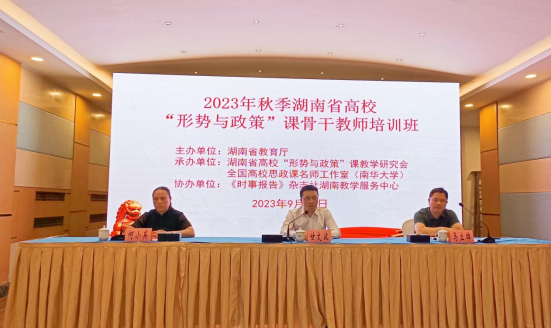 2023年春季全省高校“形势与政策”课骨干教师培训班于9月21日至22日在长沙湖南宾馆隆重开班。本次培训班由湖南省教育厅主办、湖南省高校“形势与政策”课教学研究会、全国高校思政课名师工作室(太阳成集团tyc)承办,《时事报告》杂志社湖南教学服务中心联合协办。