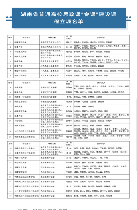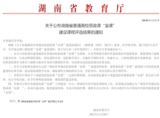 近日,湖南省教育厅公布了首批湖南省普通高校思政课“金课”建设课程评审结果,公司太阳成集团tyc黄秋生教授主讲的“马克思主义基本原理概论”和张峰林教授主讲的“中国近现代史纲要”获批湖南省思政课“金课”建设课程。此次湖南省高校共评选出30门思政课“金课”,公司获批总数在省属高校中名列前茅。