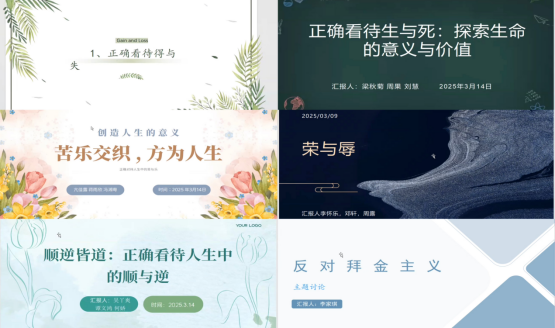 经过三周精心筹备,六个学习小组围绕“创造有意义的人生”子课题展开汇报。第一组以“正确看待得与失”为切入,分别从三个层次论证“奉献中实现人生增值”的哲理;第二组同学从个人和社会的层面分别阐述了“苦与乐”这对人生矛盾的“调味剂”作用,并以短片的展示形式丰富了汇报的内容,引发同学的深度思考和高度共鸣;就“正确看待人生中的顺与逆”而言,第三组同学则通过摆案例讲事实的分析方法,启发同学们用正确的人生态度对待顺境与逆境;第四组则以“生与死的哲学思考”为线索,剖析生命的价值与意义,总结生死观对于人生的影响,同时给同学们留下了更为宽阔的讨论空间。就“荣与辱”而言,第五组同学从内涵定义、社会影响、历史背景和现实意义等多个维度汇报了他们关于这对人生矛盾的思考。值得一提的是,第六、七组聚焦“反对拜金主义与享乐主义”,通过图文案例网红炫富、奢侈消费等社会现象,引发同学们在评论区的热烈讨论,同时也对这两种错误的人生观念的产生进行了分析,为规避错误价值观念提供了方法指导。