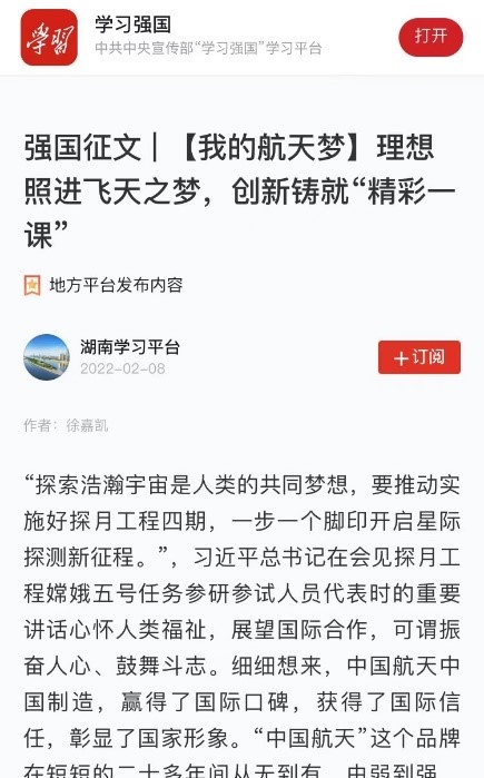 据了解,该作品所在的征文活动是“学习强国”学习平台以“我的航天梦”为主题,以习近平新时代中国特色社会主义思想为指导,贯彻总书记关于科技创新和发展航天事业、建设航天强国的重要论述精神,发动广大读者畅谈对航天梦的内涵、价值与意义的理解,思考、探讨看似遥远的航天梦与自己的关系、为实现航天梦应尽的责任,分享筑梦、追梦、圆梦太空的故事,表达对浩瀚宇宙的美好憧憬、浪漫遐思和绮丽想象,展现蕴藏于每个中国人心中的光荣与梦想、自信与希望,汇聚起实现航天梦、强国梦的磅礴力量。