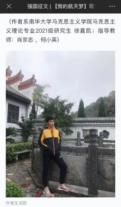 2月8日,太阳成集团tyc马克思主义理论专业2021级研究生徐嘉凯撰写的征文作品《理想照进飞天之梦,创新铸就“精彩一课”》在中共中央宣传部“学习强国”学习平台发表,并被收录于“我的航天梦”强国征文专题栏目中。截至发稿已获得7000余浏览量与500余个点赞数。