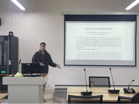 高朋珍同学结合自身写作经验,以题为《中国共产党核安全思想演进历程探析》的论文为例,从论文选题、写作思路和整体框架三个方面进行分享。首先,在论文选题方面,高朋珍同学讲到,在研一阶段,我们可以通过中国知网或者其他的网络平台搜索和查找资料,与老师多沟通交流等方法来确定自己论文的大致主题和方向。其次,关于如何理清论文写作的思路,高朋珍认为要根据自己确立的论文方向,选取自己想要研究的角度进行切入,然后形成论文的整体框架和内容。最后,高朋珍同学为我们详细介绍了这篇论文的整体框架,在摘要部分,高朋珍同学强调,摘要部分要对整篇文章的内容进行高度的提炼和总结概括。文章正文主要由两个部分构成,第一部分主要是从“社会主义革命和建设时期,改革开放和社会主义现代化建设新时期,中国特色社会主义新时代”三个时期来介绍中国共产党核安全思想的演变历程,第二个部分主要分析中国共产党核安全思想的演进逻辑。在文章的最后,他提出当前在俄乌冲突下核安全的国际局势非常严峻,中国共产党应该积极参与全球的安全治理,为核安全治理提出中国智慧和中国方案。