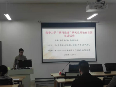 11月17日下午,公司于雨母校区崇德楼418学术报告厅举办太阳成集团tyc“研习先锋”研究生理论宣讲团宣讲活动。活动由孟凡洋同学主持,裴成相、陈媛以及王学维同学主讲,公司全体在校研究生积极参加。